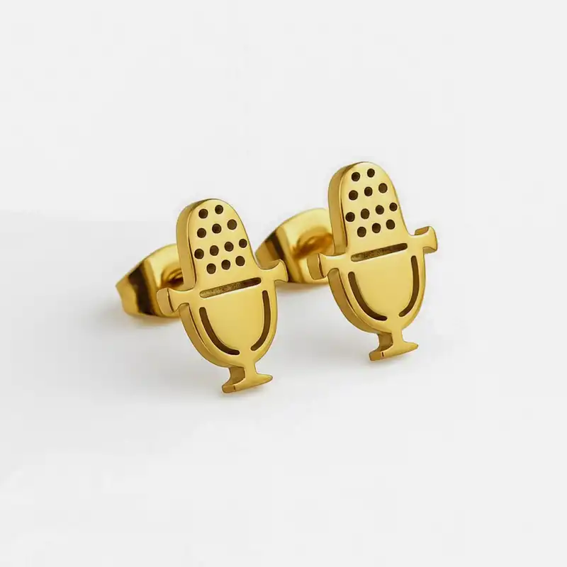 Pendientes Micrófono realizados en acero inoxidable y con baño de oro de 18k. Cierre de tuerca a presión. Tamaño de 1x1 cm.
