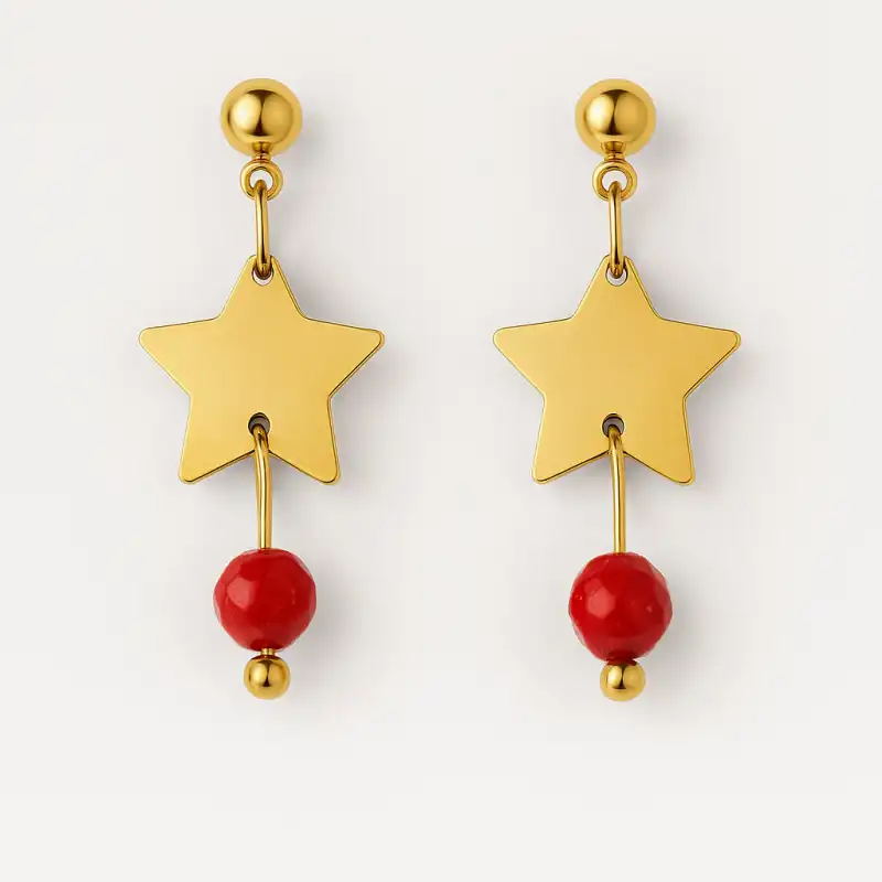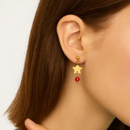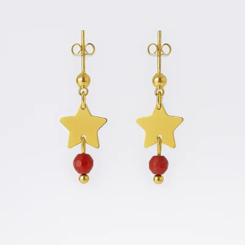 Pendientes Estrella con Piedra Granate realizados en acero inoxidable, con baño de oro de 18k y piedra natural. Tamaño 2,3x0,5 cm y cierre de tuerca de presión