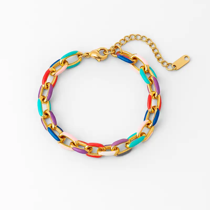 Esta pulsera es todo lo que necesitaba para darle alegría a mis looks. El dorado es muy bonito y los colores no se desgastan nada. La uso un montón y sigue perfecta.