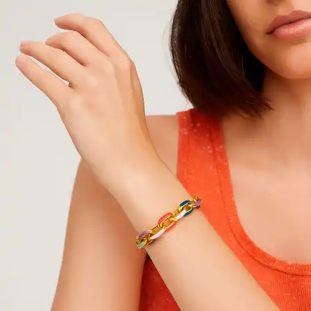 Pulsera Link Colors realizada en acero inoxidable con baño de 18k y eslabones esmaltados. Largo de la pulsera 21cm ajustable a la medida deseada. Disponible sólo en dorada.